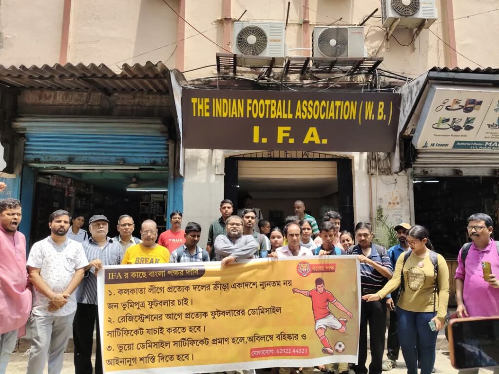 ঘরোয়া লিগে প্রথম একাদশে ভূমিপুত্রর সংখ্যা বাড়ানো নিয়ে আইএফএ অফিসের সামনে বিক্ষোভ দেখাল বাংলা পক্ষ।