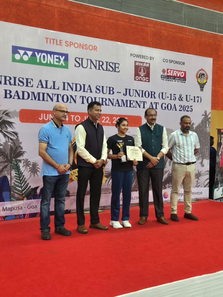 গোয়ায় অনুষ্ঠিত সারা ভারত প্রতিযোগিতায় অনূর্ধ্ব-১৫ বিভাগে রানার্স হয়ে মঞ্চে সার্টিফিকেট নিয়ে দঁা়ড়িয়ে অর্যমা।