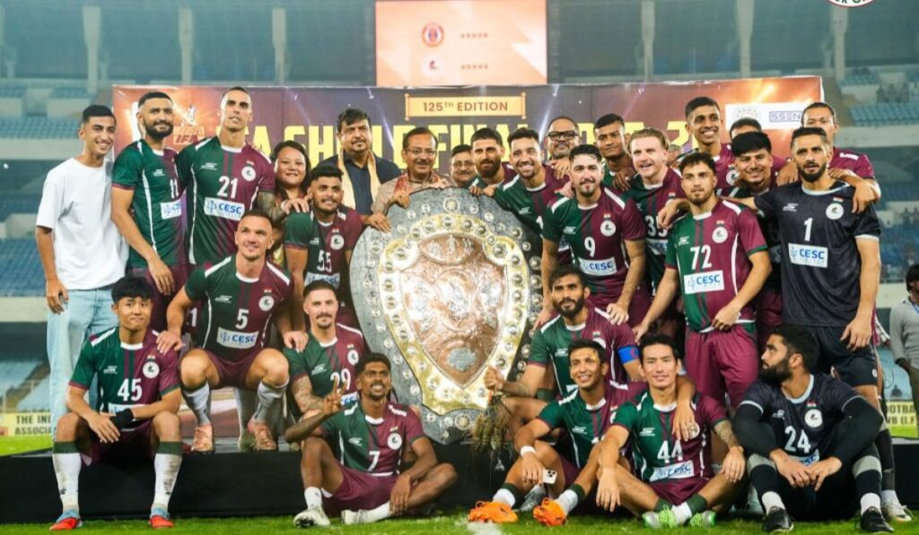 পেনাল্টি স্পেশ্যালিস্ট বিশাল কাইথ(Vishal Kaith)। তাঁর বিশ্বস্ত হাতেই শিল্ড এবার মোহনবাগানের(MBSG)। জয় গুপ্তার(Jay Gupta) শট বাঁচানর পর থেকেই শুরু হয়েছিল অপেক্ষাটা। মেহতাব সিং( Mehtab Singh)শেষ শট নিতেই যুবভারতীতে শুরু সবুজ-মেরুন উল্লাস। টাইব্রেকারে ইস্টবেঙ্গলকে(Eastbengal) ৫-৪ গোলে হারিয়ে দীর্ঘদিন পর ফের আইএফএ শিল্ড চ্যাম্পিয়ন মোহনবাগান(MBSG)। হিরোশি(Hiroshi Ibusuki) ম্যাজিক দেখতে পেল না যুবভারতী। শেষমুহূর্তে দেবজিতকে নামিয়েও চমক দিতে পারলেন অস্কার ব্রুজোঁ(Oscar Bruzon)। নির্ধারিত সময়ে এদিন ম্যাচ শেষ হয় ১-১ গোলে। অবশেষে টাই ব্রেকারেই নির্ধারিত হয় শিল্ড চ্যাম্পিয়ন। ম্যান অব দ্য ম্যাচ মহেশ হলেও, মোহনবাগান শিবিরের নায়ক যে বিশাল(Vishal Kaith) তা বলার অপেক্ষা রাখে না। তাঁর হাত ধরেই তো ২১ তম শিল্ড(Ifa Shield) জিতল মোহনবাগান। এদিন ইস্টবেঙ্গলের(Eastbengal) বিরুদ্ধে শুরু থেকেই গোল তুলে নিতে মরিয়া ছিল মোহনবাগান(MBSG)। ম্যাচের তিন মিনিটের মাথায় লিস্টন এবং ৮ মিনিটের মুখে ম্যাকলরেন(Jamie Maclaren) সহজ সুযোগ মিস না করলে তখনই এগিয়ে যেতে পারত সবুজ-মেরুন ব্রিগেড। যদিও তেমনটা হয়নি। ইস্টবেঙ্গল(Eastbengal) শুরু থেকে বলের দখল রাখলেও, বারবারই মোহনবাগান বক্সে আটকে যাচ্ছিল। ম্যাচের বয়স যখন ৩২ মিনিট। আনোয়ারের ভুলে পেনাল্টি পায় মোহনবাগান। যে কামিন্স(Jason Cummins) তাদের সবচেয়ে বড় ভরসা, তিনি বল মারলেন বাইরে। এরপর থেকেই যেন গোল পেতে মরিয়া আক্রমণ শুরু করে ইস্টবেঙ্গল। মুহূর্মুহু ইস্টবেঙ্গলের আক্রমণে ৩৫ মিনিটের মাথাতেই সাফল্য। মহেশের বাড়ানো পাসে হামিদের(Hamid Ahadad) গোল। মোহনবাগানকে(MBSG) পরিস্থিতি সামাল দেওয়ার আগেই বারবার আক্রমণে যায় ইস্টবেঙ্গল। কখনও বিপিন তো কখনও মহেশের সাজানো পাস হামিদ মিস না করলে হ্যাটট্রিক করে ফেলেই পারতেন। মোহনবাগান গ্যালারী তখন চুপচাপ। অবশেষে তাদের ত্রাতা সেই আপুইয়া(Apuia)। প্রথমার্ধের একেবারে শেষ মুহূর্তে আপুইয়ার(Apuia) দুরন্ত শট। সমতায় ফেরে মোহনবাগান। বিরতির পর কোন পক্ষ এগিয়ে যায় সেদিকেই তাকিয়ে ছিলেন সকলে। কিন্তু প্রথমার্ধের পর দ্বিতীয়ার্ধেও মোহনবাগানের সুযোগ নষ্টের খেলা ছিল অব্যহত। সেইসঙ্গে খানিকটা অনিয়ন্ত্রিত ফুটবলই যেন খেলছিল ইস্টবেঙ্গলও। আক্রমণে জোর বাড়াতে ৬৩ মিনিটে অস্কারের(Oscar Bruzon) একসঙ্গে তিনটি বদল। একসঙ্গে মাঠে আসেন হিরোশি এবং জয় গুপ্তা। কিন্তু যে হিরোশিকে নিয়ে এত হৈচৈ তিনি কিছুই করতে পারেননি। বেশ কয়েকটা হেড নিলেও তা ছিল নিস্প্রভ। অন্যদিকে মোলিনাও(Jose Molina) পরপর বেশ কয়েকটি পরিবর্তন করেন। দ্বিতীয়ার্ধের কিছুক্ষণের মধ্যেই মাঠে আসেন রবসন(Robson Robinho)। মিগুয়েল(Miguel) বনাম রবসন লড়াই দেখার জন্য তখন সকলে মুখিয়ে ছিলেন। কিন্তু ডার্বির মঞ্চে দুই দলের ব্রাজিলিয় তারকাই কিন্তু সেভাবে নজর কাড়তে পারল না। রবসন কয়