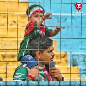 বৃহস্পতিবার নৈহাটি স্টেডিয়ামে খুদে মোহনবাগানিকে কঁাধে বসিয়ে খেলা দেখছেন এক সমর্থক।
