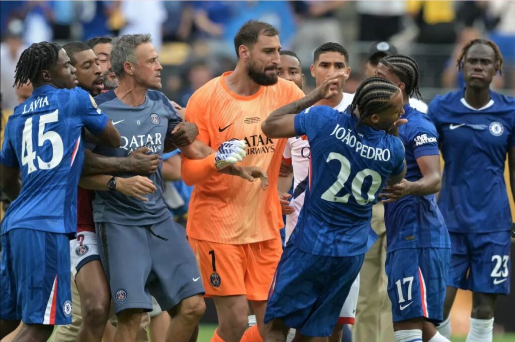 তার আগেই তো ঘটে গেল দুর্ঘটনাটা। মাঠেই, সাইডলাইনের ধারে। চেলসির তৃতীয় গোল করা, ব্রাজিলিয়ান স্ট্রাইকার হোয়াও পেড্রোকে মাটিতে ফেলে পেটাচ্ছেন পিএসজি-র সাপোর্ট-স্টাফেরা! তাদের মধ্যে ফুটবলারও রয়েছেন। আরও একজন ছিলেন। মার্কিন মিডিয়া ভাবতে পারেনি, তার আগ্রাসনের পরিমাণ সৌজন্য, ভদ্রতা ছাপিয়ে যাবে। তিনি পিএসজি-র কোচ লুই এনরিকে। তার ঘুষিতেই পপাতধরণী তলে পেড্রো! শেষপর্যন্ত, পিএসজি-র অন্য সহকারী কোচেরা এনরিকে-কে টেনে নিয়ে যান, শান্ত করেন।