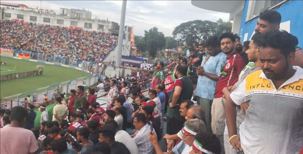 কল্যাণী স্টেডিয়ামে শনিবার ম্যাচের শেষ হওয়ার কয়েক মুহূর্ত আগে একটি ফ্লাডলাইটের আলো নিভে গেল। দুধে চোনা পড়ে যাওয়ার মত। না হলে এদিন দুপুর থেকেই স্টেডিয়াম জুড়ে শুধুই আলোর ঝলকানি। গ্যালারি পূর্ণ দু’দলের সমর্থকে। কাছা পরেও খেলা দেখতে এসেছিলেন এক ইস্টবেঙ্গল সমর্থক। সদ্য প্রয়াত হয়েছেন তার বাবা। জানালেন, বাবাই ছিলেন কট্টর ইস্টবেঙ্গল সমর্থক। ঐতিহ্যের ইস্টবেঙ্গল-মোহনবাগান ম্যাচকে ঘিরে আবেগের অন্য দিকে সবুজ-মেরুণ জার্সি পরে গ্যালারিতে হাজির এক ‘বিশেষভাবে সক্ষম’ সমর্থক। সব মিলিয়ে মরশুমের প্রথম কলকাতা ডার্বি শুরু হওয়ার আগেই শনিবারের কল্যাণী স্টেডিয়াম রঙীন!