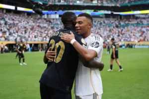 খেলার শেষে এমবাপে জড়িয়ে ধরলেন জুভেন্তাসের রোনাল্ড কোলো মুনাইকে।